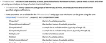 - Some properties are available for the "PrivateSchool" entity type as a whole and can be given using the form EntityValue["PrivateSchool",property]. Such properties include: