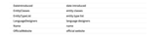 DateIntroduced date introduced EntityClasses entity classes EntityTypeList entity type list LanguageDesigners language designers Name name OfficialWebsite official website