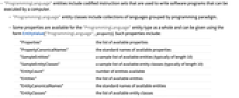 - Some properties are available for the "ProgrammingLanguage" entity type as a whole and can be given using the form EntityValue["ProgrammingLanguage",property]. Such properties include: