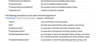"Properties" the list of available properties "PropertyCanonicalNames" the standard names of available properties "SampleEntities" a sample list of available entities (typically of length 10) "SampleEntityClasses" a sample list of available entity classes (typically of length 10) "EntityCount" number of entities available "Entities" the list of available entities "EntityCanonicalNames" the standard names of available entities "EntityClasses" the list of available entity classes "EntityClassCanonicalNames" the standard names of available entity classes "PropertyClasses" the list of available property classes "PropertyClassCanonicalNames" the standard names of available property classes "PropertyCount" number of properties available - The following annotations can be used in the third argument of EntityValue["ProgrammingLanguage",property,annotation]: