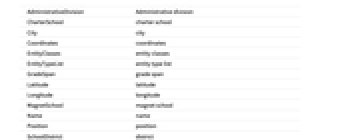 AdministrativeDivision Administrative division CharterSchool charter school City city Coordinates coordinates EntityClasses entity classes EntityTypeList entity type list GradeSpan grade span Latitude latitude Longitude longitude MagnetSchool magnet school Name name Position position SchoolDistrict district SchoolType type StudentTeacherRatio student/teacher ratio TitleIEligible Title I school TotalFreeReducedLunchStudents free/reduced price meals TotalStudents number of students TotalStudentsFraction fraction of students TotalTeachers total teachers