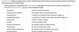 - Some properties are available for the "PublicSchool" entity type as a whole and can be given using the form EntityValue["PublicSchool",property]. Such properties include: