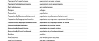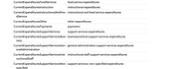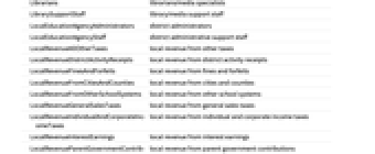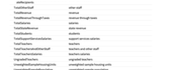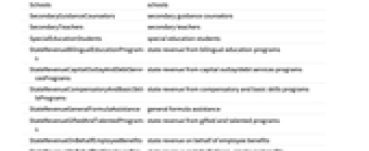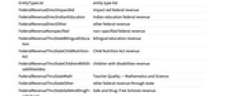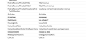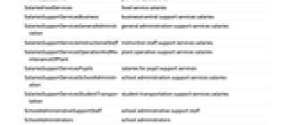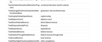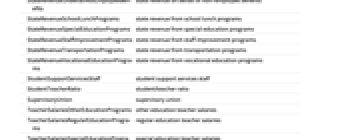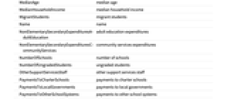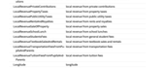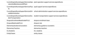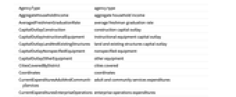 AgencyType agency type AggregateHouseholdIncome aggregate household income AveragedFreshmenGraduationRate average freshman graduation rate CapitalOutlayConstruction construction capital outlay CapitalOutlayInstructionalEquipment instructional equipment capital outlay CapitalOutlayLandAndExistingStructures land and existing structures capital outlay CapitalOutlayNonspecifiedEquipment nonspecified equipment CapitalOutlayOtherEquipment other equipment CitiesCoveredByDistrict cities covered Coordinates coordinates CurrentExpendituresAdultAndCommunityServices adult and community services expenditures CurrentExpendituresEnterpriseOperations enterprise operations expenditures CurrentExpendituresFoodServices food service expenditures CurrentExpendituresInstruction instructional expenditures CurrentExpendituresInstructionalAndFoodService instructional and food service expenditures CurrentExpendituresOther other expenditures CurrentExpendituresPayments payments CurrentExpendituresSupportServices support services expenditures CurrentExpendituresSupportServicesBusiness business/central support services expenditures CurrentExpendituresSupportServicesGeneralAdministration general administration support services expenditures CurrentExpendituresSupportServicesInstructionalStaff instructional staff support services expenditures CurrentExpendituresSupportServicesNonspecified support services: non-specified expenditures CurrentExpendituresSupportServicesOperationAndMaintenanceOfPlant plant operation support services expenditures CurrentExpendituresSupportServicesPupils pupil support services expenditures CurrentExpendituresSupportServicesSchoolAdministration school administration support services expenditures CurrentExpendituresSupportServicesStudentTransportation student transportation support services expenditures DropoutEnrollmentBaseGrade9To12 dropout enrollment base DropoutRateGrade9To12 dropout rate ElementaryGuidanceCounselors elementary guidance counselors ElementaryTeachers elementary teachers ELLStudents ELL students EntityClasses entity classes EntityTypeList entity type list FederalRevenueDirectImpactAid impact aid federal revenue FederalRevenueDirectIndianEducation Indian education federal revenue FederalRevenueDirectOther other federal revenue FederalRevenueNonspecified non-specified federal revenue FederalRevenueThruStateBilingualEducation bilingual education revenue FederalRevenueThruStateChildNutritionAct Child Nutrition Act revenue FederalRevenueThruStateChildrenWithDisabilitiesIdea children with disabilities revenue FederalRevenueThruStateMath Teacher Quality — Mathematics and Science FederalRevenueThruStateOther other federal revenue through state FederalRevenueThruStateSafeAndDrugFreeSchools Safe and Drug–Free Schools revenue FederalRevenueThruStateTitleI Title I revenue FederalRevenueThruStateTitleV Title V Part A revenue FederalRevenueThruStateVocationalAndTechEducation vocational and technical education revenue GiniIndex Gini index GradeSpan grade span HasPolygon has polygon? HousingUnits households InstructionalAides instructional aides InstructionalCoordinatorsAndSupervisors instructional coordinators and supervisors InterestOnDebt interest on debt KindergartenTeachers kindergarten teachers Latitude latitude Librarians librarians/media specialists LibrarySupportStaff library/media support staff LocalEducationAgencyAdministrators district administrators LocalEducationAgencyStaff district administrative support staff LocalRevenueAllOtherTaxes local revenue from other taxes LocalRevenueDistrictActivityReceipts local revenue from district activity receipts LocalRevenueFinesAndForfeits local revenue from fines and forfeits LocalRevenueFromCitiesAndCounties local revenue from cities and counties LocalRevenueFromOtherSchoolSystems local revenue from other school systems LocalRevenueGeneralSalesTaxes local revenue from general sales taxes LocalRevenueIndividualAndCorporateIncomeTaxes local revenue from individual and corporate income taxes LocalRevenueInterestEarnings local revenue from interest earnings LocalRevenueParentGovernmentContributions local revenue from parent government contributions LocalRevenuePrivateContributions local revenue from private contributions LocalRevenuePropertyTaxes local revenue from property taxes LocalRevenuePublicUtilityTaxes local revenue from public utility taxes LocalRevenueRentsAndRoyalties local revenue from rents and royalties LocalRevenueSaleOfProperty local revenue from property sales LocalRevenueSchoolLunch local revenue from school lunches LocalRevenueStudentsFees local revenue from general student fees LocalRevenueTextbookSalesAndRentals local revenue from textbook sales and rentals LocalRevenueTransportationFeesFromPupilsAndParents local revenue from transportation fees LocalRevenueTuitionFeesFromPupilsAndParents local revenue from tuition fees Longitude longitude MedianAge median age MedianHouseholdIncome median household income MigrantStudents migrant students Name name NonElementarySecondaryExpendituresAdultEducation adult education expenditures NonElementarySecondaryExpendituresCommunityServices community services expenditures NumberOfSchools number of schools NumberOfUngradedStudents ungraded students OtherSupportServicesStaff other support services staff PaymentsToCharterSchools payments to charter schools PaymentsToLocalGovernments payments to local governments PaymentsToOtherSchoolSystems payments to other school systems PaymentsToPrivateSchools payments to private schools PaymentsToStateGovernments payments to state governments PerCapitaIncome per capita income Polygon polygon Population population PopulationByEducationalAttainment population by educational attainment PopulationByGeographicalMobility population by migration in previous 12 months PopulationByLanguageSpokenAtHome population by language spoken at home PopulationByMaritalStatus population by marital status PopulationByPovertyStatus population by poverty status Populatio