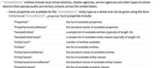 - Some properties are available for the "SchoolDistrict" entity type as a whole and can be given using the form EntityValue["SchoolDistrict",property]. Such properties include:
