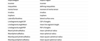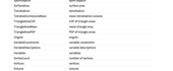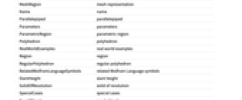 AlternateNames alternate names AssociatedPeople associated people Boundary boundary BoundaryMeshRegion boundary mesh representation BoundarySurface boundary surface BoundingBox bounding box corners Centroid centroid Circumcenter circumcenter Circumdiameter circumdiameter Circumradius circumradius Circumsphere circumsphere Classes classes Concave concave ConstantWidth constant width Convex convex ConvexityCoefficient convexity coefficient CoordinateBounds coordinate bounds CrossSections cross sections EntityClasses entity classes EntityTypeList entity type list FaceCount number of faces GeneralizedDiameter generalized diameter Graphics3D 3‐D graphics Height height Hexahedron hexahedron Image image ImplicitRegion implicit region Incenter incenter Inequalities defining inequalities InertiaTensor moment of inertia tensor Inradius inradius Insphere insphere LateralSurfaceArea lateral surface area LineSegmentLengthCDF CDF of lengths LineSegmentLengthMean mean line segment length LineSegmentLengthPDF PDF of lengths MeanCylindricalRadius mean cylindrical radius MeanSphericalRadius mean spherical radius MeanSquareCylindricalRadius mean square cylindrical radius MeanSquareSphericalRadius mean square spherical radius MeshRegion mesh representation Name name Parallelepiped parallelepiped Parameters parameters ParametricRegion parametric region Polyhedron polyhedron RealWorldExamples real world examples Region region RegularPolyhedron regular polyhedron RelatedWolframLanguageSymbols related Wolfram Language symbols SlantHeight slant height SolidOfRevolution solid of revolution SpecialCases special cases SportObjects sport objects SurfaceArea surface area Tetrahedron tetrahedron TetrahedronVolumeMean mean tetrahedron volume TriangleAreaCDF CDF of triangle areas TriangleAreaMean mean triangle area TriangleAreaPDF PDF of triangle areas Ungula ungula VariableConstraints variable constraints VariableDescriptions variable descriptions Variables variables VertexCount number of vertices Vertices vertices Volume volume