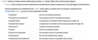 - "Solid" entity classes include mathematical classifications based on geometric and topological characteristics.