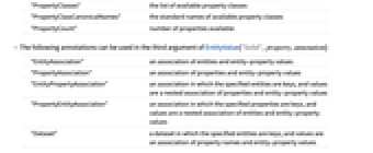 "EntityAssociation" an association of entities and entity-property values "PropertyAssociation" an association of properties and entity-property values "EntityPropertyAssociation" an association in which the specified entities are keys, and values are a nested association of properties and entity-property values "PropertyEntityAssociation" an association in which the specified properties are keys, and values are a nested association of entities and entity-property values "Dataset" a dataset in which the specified entities are keys, and values are an association of property names and entity-property values - The following annotations can be used in the second argument of EntityValue[property,annotation]: