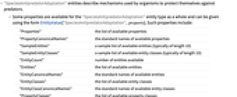 - Some properties are available for the "SpeciesAntipredatorAdaptation" entity type as a whole and can be given using the form EntityValue["SpeciesAntipredatorAdaptation",property]. Such properties include: