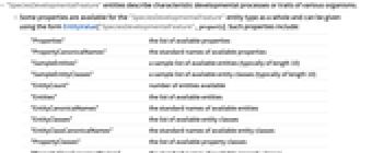 "Properties" the list of available properties "PropertyCanonicalNames" the standard names of available properties "SampleEntities" a sample list of available entities (typically of length 10) "SampleEntityClasses" a sample list of available entity classes (typically of length 10) "EntityCount" number of entities available "Entities" the list of available entities "EntityCanonicalNames" the standard names of available entities "EntityClasses" the list of available entity classes "EntityClassCanonicalNames" the standard names of available entity classes "PropertyClasses" the list of available property classes "PropertyClassCanonicalNames" the standard names of available property classes "PropertyCount" number of properties available - The following annotations can be used in the third argument of EntityValue["SpeciesDevelopmentalFeature",property,annotation]: