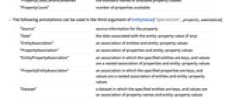 "Source" source information for the property "Date" the date associated with the entity-property value (if any) "EntityAssociation" an association of entities and entity-property values "PropertyAssociation" an association of properties and entity-property values "EntityPropertyAssociation" an association in which the specified entities are keys, and values are a nested association of properties and entity-property values "PropertyEntityAssociation" an association in which the specified properties are keys, and values are a nested association of entities and entity-property values "Dataset" a dataset in which the specified entities are keys, and values are an association of property names and entity-property values - The following annotations can be used in the second argument of EntityValue[property,annotation]: