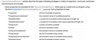 - Some properties are available for the "SpeciesFeedingBehavior" entity type as a whole and can be given using the form EntityValue["SpeciesFeedingBehavior",property]. Such properties include: