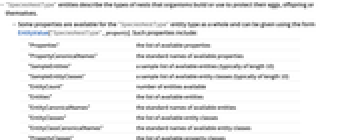 - Some properties are available for the "SpeciesNestType" entity type as a whole and can be given using the form EntityValue["SpeciesNestType",property]. Such properties include: