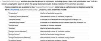 - "SpeciesPhyleticGroup" entities describe the groups of organisms, including mono-, para- and polyphyletic taxa. Fish is a known paraphyletic taxon in which the group does not include all descendants of the common ancestor.