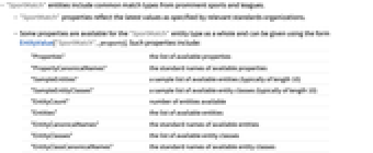 - Some properties are available for the "SportMatch" entity type as a whole and can be given using the form EntityValue["SportMatch",property]. Such properties include: