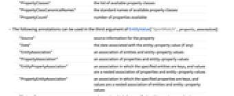 "Source" source information for the property "Date" the date associated with the entity-property value (if any) "EntityAssociation" an association of entities and entity-property values "PropertyAssociation" an association of properties and entity-property values "EntityPropertyAssociation" an association in which the specified entities are keys, and values are a nested association of properties and entity-property values "PropertyEntityAssociation" an association in which the specified properties are keys, and values are a nested association of entities and entity-property values "Dataset" a dataset in which the specified entities are keys, and values are an association of property names and entity-property values - The following annotations can be used in the second argument of EntityValue[property,annotation]: