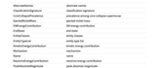 AlternateNames alternate names ClassificationSignature classification signature CoreCollapsePrevalence prevalence among core‐collapse supernovae EjectedNickelMass ejected nickel mass EMEnergyContribution EM energy contribution EndState end state EntityClasses entity classes EntityTypeList entity type list KineticEnergyContribution kinetic energy contribution Mechanism mechanism Name name NeutrinoEnergyContribution neutrino energy contribution PeakAbsoluteMagnitude peak absolute magnitude ProgenitorStar progenitor star ProgenitorStarMass progenitor star mass TimeFromPeakToTenPercentLuminosity time from peak to 10% luminosity TimeToPeakLuminosity time to peak luminosity TotalEnergy total energy
