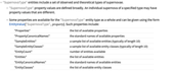 "Properties" the list of available properties "PropertyCanonicalNames" the standard names of available properties "SampleEntities" a sample list of available entities (typically of length 10) "SampleEntityClasses" a sample list of available entity classes (typically of length 10) "EntityCount" number of entities available "Entities" the list of available entities "EntityCanonicalNames" the standard names of available entities "EntityClasses" the list of available entity classes "EntityClassCanonicalNames" the standard names of available entity classes "PropertyClasses" the list of available property classes "PropertyClassCanonicalNames" the standard names of available property classes "PropertyCount" number of properties available - The following annotations can be used in the third argument of EntityValue["SupernovaType",property,annotation]: