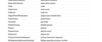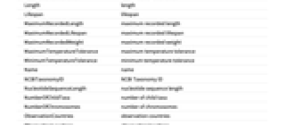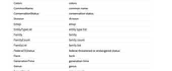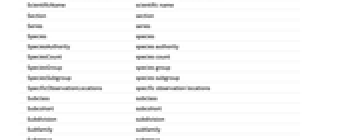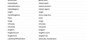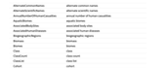 AlternateCommonNames alternate common names AlternateScientificNames alternate scientific names AnnualNumberOfHumanCasualties annual number of human casualities AquaticBiomes aquatic biomes AssociatedBodySites associated body sites AssociatedHumanDiseases associated human diseases BiogeographicRegions biogeographic regions Biomass biomass Biomes biomes Class class ClassCount class count ClassList class list Cohort cohort Colors colors CommonName common name ConservationStatus conservation status Division division Emoji emoji EntityClasses entity classes EntityTypeList entity type list Family family FamilyCount family count FamilyList family list FederalTEStatus federal threatened or endangered status Form form GenerationTime generation time Genus genus GenusCount genus count HabitatDepth habitat depth HabitatElevation habitat elevation HabitatRegions habitat regions Height height HomeRangeArea home range area Hosts hosts Image image Infraclass infraclass Infraorder infraorder Kingdom kingdom KingdomCount kingdom count KingdomList kingdom list LatestYearOfPublication latest year of publication Length length Lifespan lifespan Mass weight MaximumRecordedLength maximum recorded length MaximumRecordedLifespan maximum recorded lifespan MaximumRecordedWeight maximum recorded weight MaximumTemperatureTolerance maximum temperature tolerance MinimumTemperatureTolerance minimum temperature tolerance Name name NCBITaxonomyID NCBI Taxonomy ID NucleotideSequenceLength nucleotide sequence length NumberOfChildTaxa number of child taxa NumberOfChromosomes number of chromosomes ObservationCountries observation countries ObservationLocations observation locations ObservationOceans observation oceans Order order OrderCount order count OrderList order list OriginalYearOfPublication original year of publication ParentTaxon parent taxon Parvorder parvorder PhyleticGroups phyletic groups Phylum phylum PhylumCount phylum count PhylumList phylum list PrimaryTaxonomicSequence primary taxonomic sequence RefSeqAssemblyAccessionNumber RefSeq assembly accession number ScientificName scientific name Section section Series series Species species SpeciesAuthority species authority SpeciesCount species count SpeciesGroup species group SpeciesSubgroup species subgroup SpecificObservationLocations specific observation locations Subclass subclass Subcohort subcohort Subdivision subdivision Subfamily subfamily Subgenus subgenus Subkingdom subkingdom Suborder suborder Subphylum subphylum Subsection subsection Subspecies subspecies Subtribe subtribe Superclass superclass Superdivision superdivision Superfamily superfamily Superkingdom superkingdom Superorder superorder Superphylum superphylum TaxonomicLevel taxonomic level TaxonomicSequence taxonomic sequence TaxonomicSequenceList taxonomic sequence list TerrestrialBiomes terrestrial biomes Tribe tribe TrophicLevel trophic level Variety variety WetlandBiomes wetland biomes WorldPopulation world population