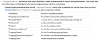 "Properties" the list of available properties "PropertyCanonicalNames" the standard names of available properties "SampleEntities" a sample list of available entities (typically of length 10) "EntityCount" number of entities available "Entities" the list of available entities "EntityCanonicalNames" the standard names of available entities "PropertyClasses" the list of available property classes "PropertyClassCanonicalNames" the standard names of available property classes "PropertyCount" number of properties available - The following annotations can be used in the third argument of EntityValue["TaxonomicSpecies",property,annotation]: