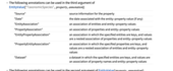 "Source" source information for the property "Date" the date associated with the entity-property value (if any) "EntityAssociation" an association of entities and entity-property values "PropertyAssociation" an association of properties and entity-property values "EntityPropertyAssociation" an association in which the specified entities are keys, and values are a nested association of properties and entity-property values "PropertyEntityAssociation" an association in which the specified properties are keys, and values are a nested association of entities and entity-property values "Dataset" a dataset in which the specified entities are keys, and values are an association of property names and entity-property values - The following annotations can be used in the second argument of EntityValue[property,annotation]: