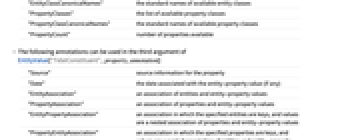"Source" source information for the property "Date" the date associated with the entity-property value (if any) "EntityAssociation" an association of entities and entity-property values "PropertyAssociation" an association of properties and entity-property values "EntityPropertyAssociation" an association in which the specified entities are keys, and values are a nested association of properties and entity-property values "PropertyEntityAssociation" an association in which the specified properties are keys, and values are a nested association of entities and entity-property values "Dataset" a dataset in which the specified entities are keys, and values are an association of property names and entity-property values - The following annotations can be used in the second argument of EntityValue[property,annotation]: