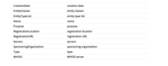 CreationDate creation date EntityClasses entity classes EntityTypeList entity type list Name name Purpose purpose RegistrationLocation registration location RegistrationURL registration URL Servers servers SponsoringOrganization sponsoring organization Type type WHOIS WHOIS server