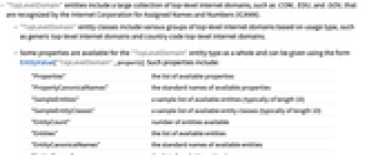 - "TopLevelDomain" entity classes include various groups of top-level internet domains based on usage type, such as generic top-level internet domains and country code top-level internet domains.