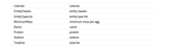 Calories calories EntityClasses entity classes EntityTypeList entity type list MinimumMass minimum mass per egg Name name Protein protein Sodium sodium TotalFat total fat