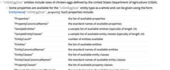 - Some properties are available for the "USDAEggSize" entity type as a whole and can be given using the form EntityValue["USDAEggSize",property]. Such properties include: