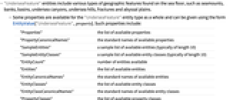 "Properties" the list of available properties "PropertyCanonicalNames" the standard names of available properties "SampleEntities" a sample list of available entities (typically of length 10) "SampleEntityClasses" a sample list of available entity classes (typically of length 10) "EntityCount" number of entities available "Entities" the list of available entities "EntityCanonicalNames" the standard names of available entities "EntityClasses" the list of available entity classes "EntityClassCanonicalNames" the standard names of available entity classes "PropertyClasses" the list of available property classes "PropertyClassCanonicalNames" the standard names of available property classes "PropertyCount" number of properties available - The following annotations can be used in the third argument of EntityValue["UnderseaFeature",property,annotation]: