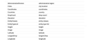 AdministrativeDivision administrative region Cities city location Coordinates coordinates Countries country DropCount drop count Elevation elevation EntityClasses entity classes EntityTypeList entity type list Height height Image image Latitude latitude LongestDrop longest drop Longitude longitude Name name Position position Seasonality seasonality Type type Watercourse watercourse Width average width