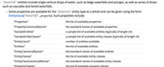 - Some properties are available for the "Waterfall" entity type as a whole and can be given using the form EntityValue["Waterfall",property]. Such properties include: