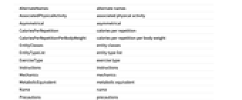 AlternateNames alternate names AssociatedPhysicalActivity associated physical activity Asymmetrical asymmetrical CaloriesPerRepetition calories per repetition CaloriesPerRepetitionPerBodyWeight calories per repetition per body weight EntityClasses entity classes EntityTypeList entity type list ExerciseType exercise type Instructions instructions Mechanics mechanics MetabolicEquivalent metabolic equivalent Name name Precautions precautions PrimaryMuscles primary muscles PrimaryMusclesImage primary muscles image RelativeCenterOfMassPositionChange relative center of mass position change RelativeWeightVerticalDisplacement relative weight vertical displacement RequiredRepetitionsToBurn100Cal required repetitions to burn 100 Calories SimplifiedSchematicEnd simplified schematic end position SimplifiedSchematicStart simplified schematic start position SitesOfImprovedStrength sites of improved strength SupportingMuscles supporting muscles SupportingMusclesImage supporting muscles image Variations variations