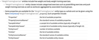- "WeightTrainingExercise" entities include free weight and body weight training exercises.