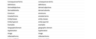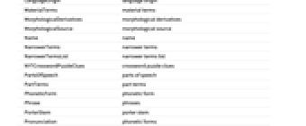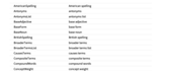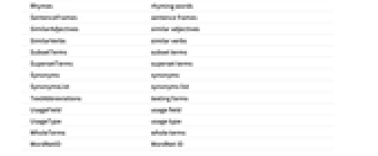 AmericanSpelling American spelling Antonyms antonyms AntonymsList antonyms list BaseAdjective base adjective BaseForm base form BaseNoun base noun BritishSpelling British spelling BroaderTerms broader terms BroaderTermsList broader terms list CausesTerms causes terms CompositeTerms composite terms CompoundWords compound words ConceptWeight concept weight ConsequencesTerms consequences terms Definitions definitions DerivedAdjectives derived adjectives DerivedAdverbs derived adverbs Emoticon emoticons EntailedTerms entailed terms EntityClasses entity classes EntityTypeList entity type list Examples examples GeographicDomain geographic domain Hyphenation hyphenation Image image InflectedForms inflected forms LanguageOrigin language origin MaterialTerms material terms MorphologicalDerivatives morphological derivatives MorphologicalSource morphological source Name name NarrowerTerms narrower terms NarrowerTermsList narrower terms list NYTCrosswordPuzzleClues crossword puzzle clues PartsOfSpeech parts of speech PartTerms part terms PhoneticForm phonetic form Phrase phrases PorterStem porter stem Pronunciation phonetic forms Rhymes rhyming words SentenceFrames sentence frames SimilarAdjectives similar adjectives SimilarVerbs similar verbs SubsetTerms subset terms SupersetTerms superset terms Synonyms synonyms SynonymsList synonyms list TextAbbreviations texting forms UsageField usage field UsageType usage type WholeTerms whole terms WordNetID WordNet ID