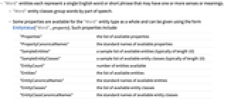 "Properties" the list of available properties "PropertyCanonicalNames" the standard names of available properties "SampleEntities" a sample list of available entities (typically of length 10) "SampleEntityClasses" a sample list of available entity classes (typically of length 10) "EntityCount" number of entities available "Entities" the list of available entities "EntityCanonicalNames" the standard names of available entities "EntityClasses" the list of available entity classes "EntityClassCanonicalNames" the standard names of available entity classes "PropertyClasses" the list of available property classes "PropertyClassCanonicalNames" the standard names of available property classes "PropertyCount" number of properties available - The following annotations can be used in the third argument of EntityValue["Word",property,annotation]: