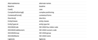 AlternateNames alternate names Baseline baseline CaseQ case ComplexPositioningQ complex positioning ContextualFormsQ contextual forms DiacriticsQ diacritics EntityClasses entity classes EntityTypeList entity type list ISO15924Code ISO 15924 four‐letter code ISO15924CodeNumeric ISO 15924 numeric code ISO15924Group ISO 15924 group ISO15924Name ISO 15924 name Ligatures ligatures Name name ReorderingQ reordering required SplitGraphsQ split graphs Status status Type type UnicodeAlias Unicode alias WhiteSpace white space WritingDirection writing direction