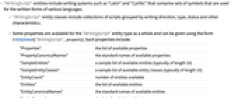 - Some properties are available for the "WritingScript" entity type as a whole and can be given using the form EntityValue["WritingScript",property]. Such properties include: