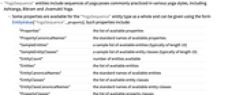 - Some properties are available for the "YogaSequence" entity type as a whole and can be given using the form EntityValue["YogaSequence",property]. Such properties include: