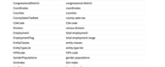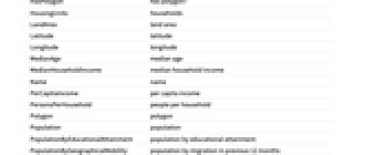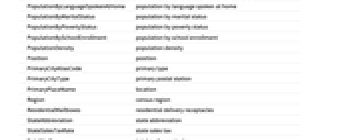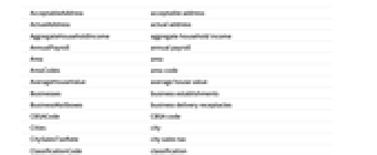 AcceptableAddress acceptable address ActualAddress actual address AggregateHouseholdIncome aggregate household income AnnualPayroll annual payroll Area area AreaCodes area code AverageHouseValue average house value Businesses business establishments BusinessMailboxes business delivery receptacles CBSACode CBSA code Cities city CitySalesTaxRate city sales tax ClassificationCode classification CongressionalDistrict congressional district Coordinates coordinates Counties counties CountySalesTaxRate county sales tax CSACode CSA code Division census division Employment total employment EmploymentFlag total employment range EntityClasses entity classes EntityTypeList entity type list FIPSCode FIPS code GenderPopulations gender populations GiniIndex Gini index HasPolygon has polygon? HousingUnits households LandArea land area Latitude latitude Longitude longitude MedianAge median age MedianHouseholdIncome median household income Name name PerCapitaIncome per capita income PersonsPerHousehold people per household Polygon polygon Population population PopulationByEducationalAttainment population by educational attainment PopulationByGeographicalMobility population by migration in previous 12 months PopulationByLanguageSpokenAtHome population by language spoken at home PopulationByMaritalStatus population by marital status PopulationByPovertyStatus population by poverty status PopulationBySchoolEnrollment population by school enrollment PopulationDensity population density Position position PrimaryCityAliasCode primary type PrimaryCityType primary postal station PrimaryPlaceName location Region census region ResidentialMailboxes residential delivery receptacles StateAbbreviation state abbreviation StateSalesTaxRate state sales tax TotalMailboxes total mail receptacles TotalSalesTaxRate total sales tax UnacceptableAddress unacceptable address UnweightedSampleHousingUnits unweighted sample housing units UnweightedSamplePopulation unweighted sample population USStates US state WaterArea water area