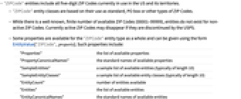 "Properties" the list of available properties "PropertyCanonicalNames" the standard names of available properties "SampleEntities" a sample list of available entities (typically of length 10) "SampleEntityClasses" a sample list of available entity classes (typically of length 10) "EntityCount" number of entities available "Entities" the list of available entities "EntityCanonicalNames" the standard names of available entities "EntityClasses" the list of available entity classes "EntityClassCanonicalNames" the standard names of available entity classes "PropertyClasses" the list of available property classes "PropertyClassCanonicalNames" the standard names of available property classes "PropertyCount" number of properties available - The following annotations can be used in the third argument of EntityValue["ZIPCode",property,annotation]: