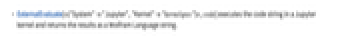 - ExternalEvaluate[<|"System""Jupyter","Kernel""kernelspec"|>,code] executes the code string in a Jupyter kernel and returns the results as a Wolfram Language string.