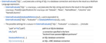 - ExternalEvaluate["SQL",code] executes a string of SQL in a database connection and returns the result as a Wolfram Language expression.