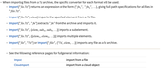 - Import["file.7z",{{elem1,elem2,…}}] imports multiple elements.