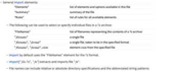 "Elements" list of elements and options available in this file "Summary" summary of the file "Rules" list of rules for all available elements - The following can be used to select or specify individual files in a 7z archive: