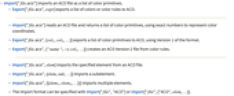 - Import["file.aco"] reads an ACO file and returns a list of color primitives, using exact numbers to represent color coordinates.