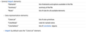 "ColorList" list of color primitives "ColorRules" rules for named colors "ColorSetters" list of ColorSetter objects - Import by default uses the "ColorList" element.