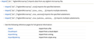 - Import["file",{"AgilentMicroarray",{elem1,elem2,…}}] imports multiple elements.