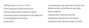 - Compresses data using a combination of the Burrows–Wheeler transform and Huffman entropy coding.