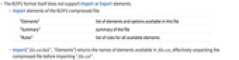 "Elements" list of elements and options available in this file "Summary" summary of the file "Rules" list of rules for all available elements - Import["file.ext.bz2","Elements"] returns the names of elements available in file.ext, effectively unpacking the compressed file before importing "file.ext".